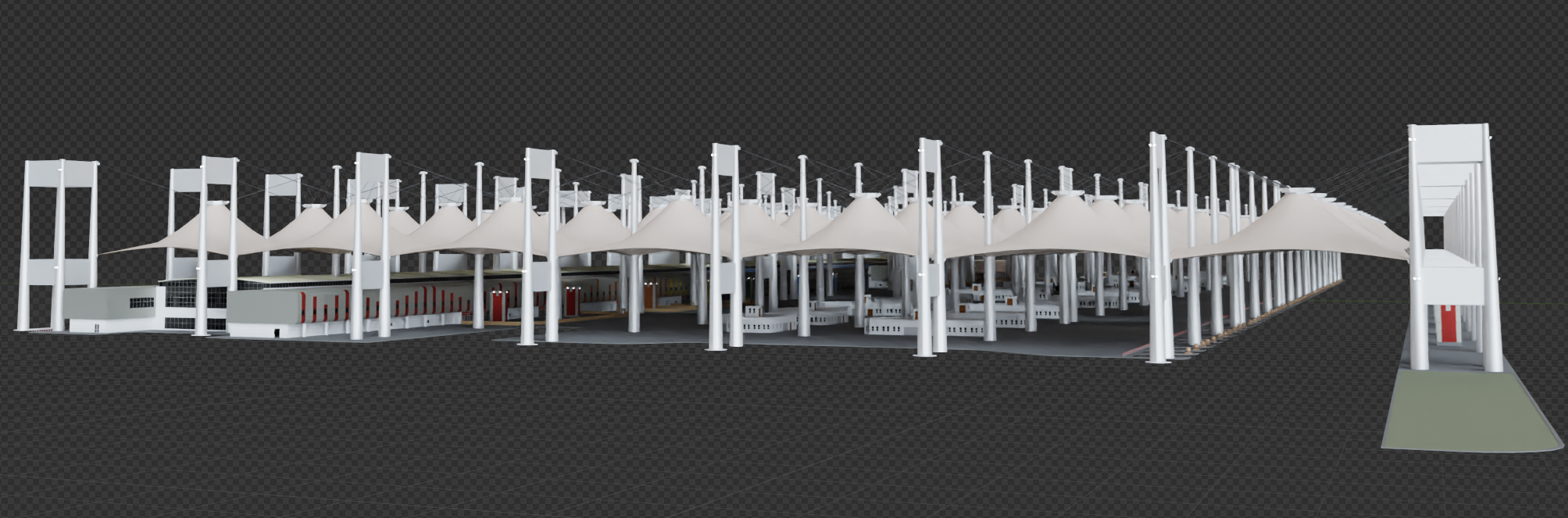Faithfully modeled terminal structures featuring realistic geometry, materials, and signature roof architecture.